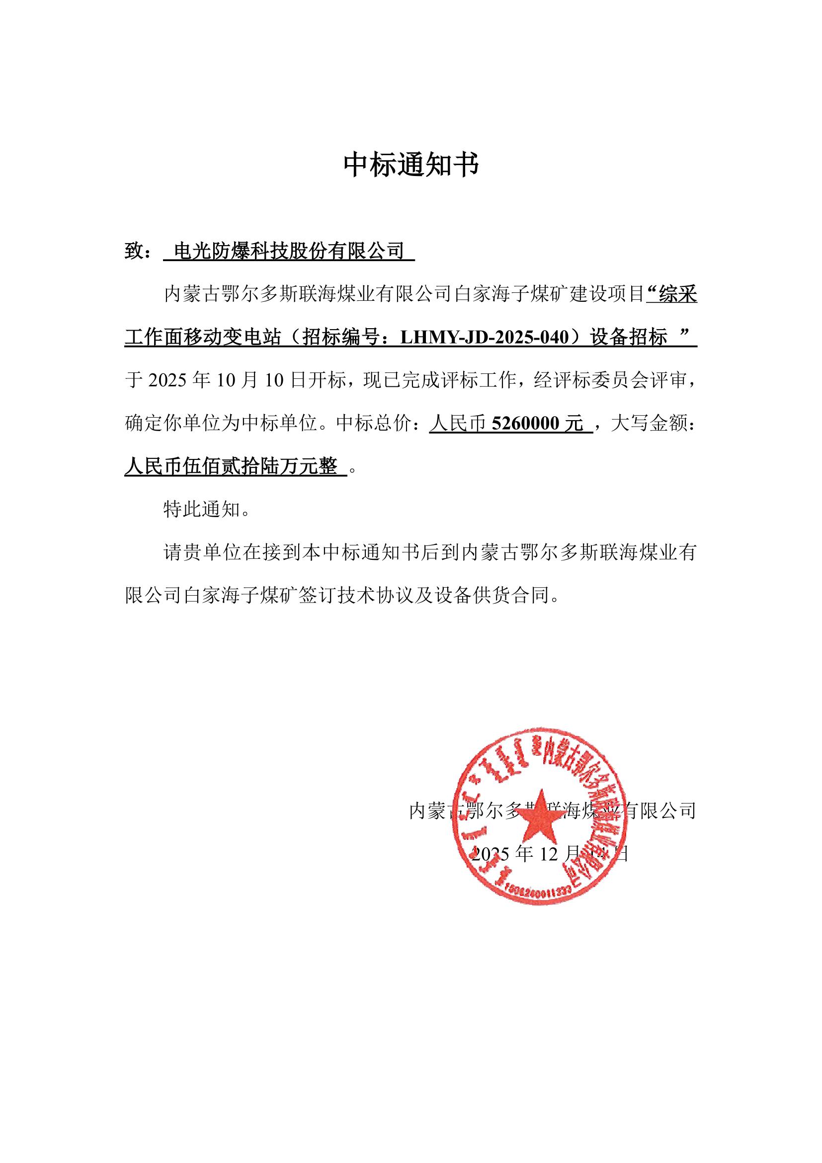 内蒙古鄂尔多斯联海煤业有限公司白家海子煤矿建设项目综采工作面移动变电站设备招标中标通知书