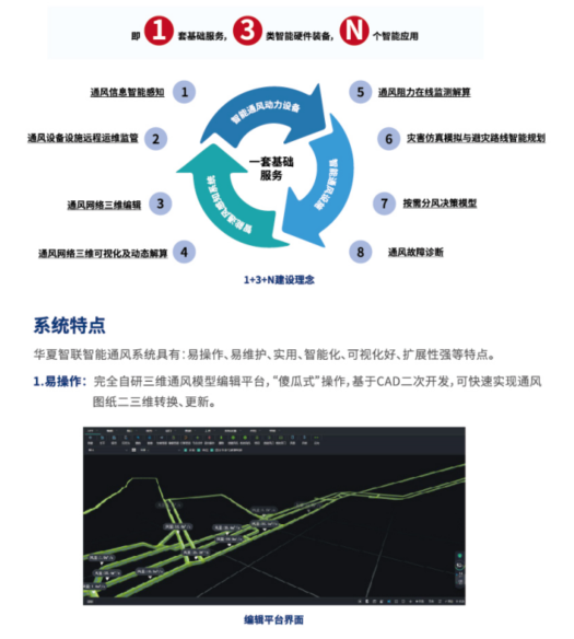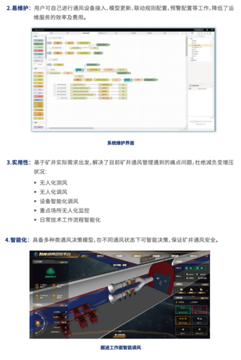 系统简介 华夏智联煤矿智能通风系统是专为煤矿研发的智能通风管理系统。该系统通过智能通风管控平台,打造"1+3+N”体系,即:通过1套智能通风基础服务,3类智能硬件装备,N个智能化应用实现矿井通风智能化。该系统在保证矿井通风安全的前提下,可节约成本、提高通风效率。