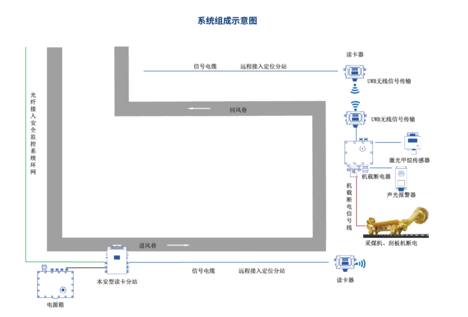 系统简介 国家矿山安全监察局《煤矿安全规程(修订草案 征求意见稿)》第五百三十七条要求采煤机、据进机、据锚一体机、连续采煤机等必须设置具有断电闭锁功能的甲烷断电仪。高瓦斯、突出矿井采煤机机载断电仪的甲烷浓度以及煤机开停等监控数据应接入安全监控系统。 华夏智联基于UWB数据传输技术,激光甲烷、断电技术,研发了可接入安全监控系统的大型移动设备甲烷测定、断电系统。采煤机、掘进机安装激光甲烷传感器、声光报警器、断电控制器,通过机载矿用本安型读卡器的无线链路传输给工作面上下隅角设置的矿用本安型读卡器,可实现实时甲烷