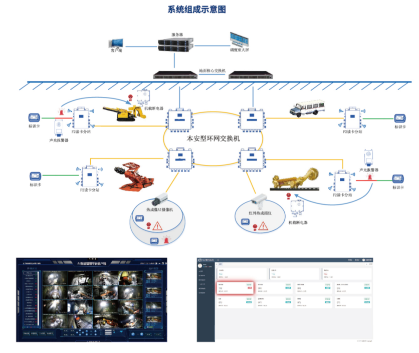 系统简介 强化井下危险作业区域安全管理,有效防止掘进机、运输设备等大型生产设备对人员的伤害,主要目的是在掘进工作面、采煤工作面、密闭墙、带式输送机等大型设备设置电子围栏,通过精确定位系统、红外感应、机器视觉技术,实现作业人员进入危险区域,发出声光报警,并闭锁大型设备,避免事故发生。根据煤矿井下的实际装备要求和安装场景的不同。华夏智联研发了煤矿井下电子围栏系统,系统可单独或组合使用UWB精确定位、热成像AI摄像机、热释电传感器实现人员接近监测及设备闭锁;并开发了井下电子围栏和监控系统移动设备瓦斯超限闭锁的复