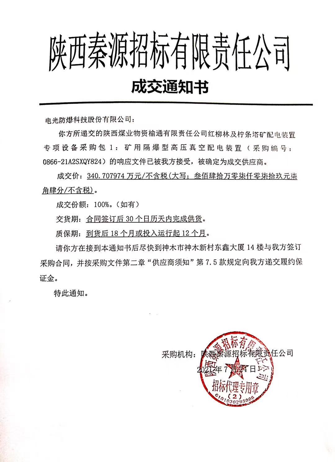 陕西煤业物资榆通有限责任公司红柳林及柠条塔矿配电装置专项设备采购包1矿用隔爆型高压配电装置成交通知书