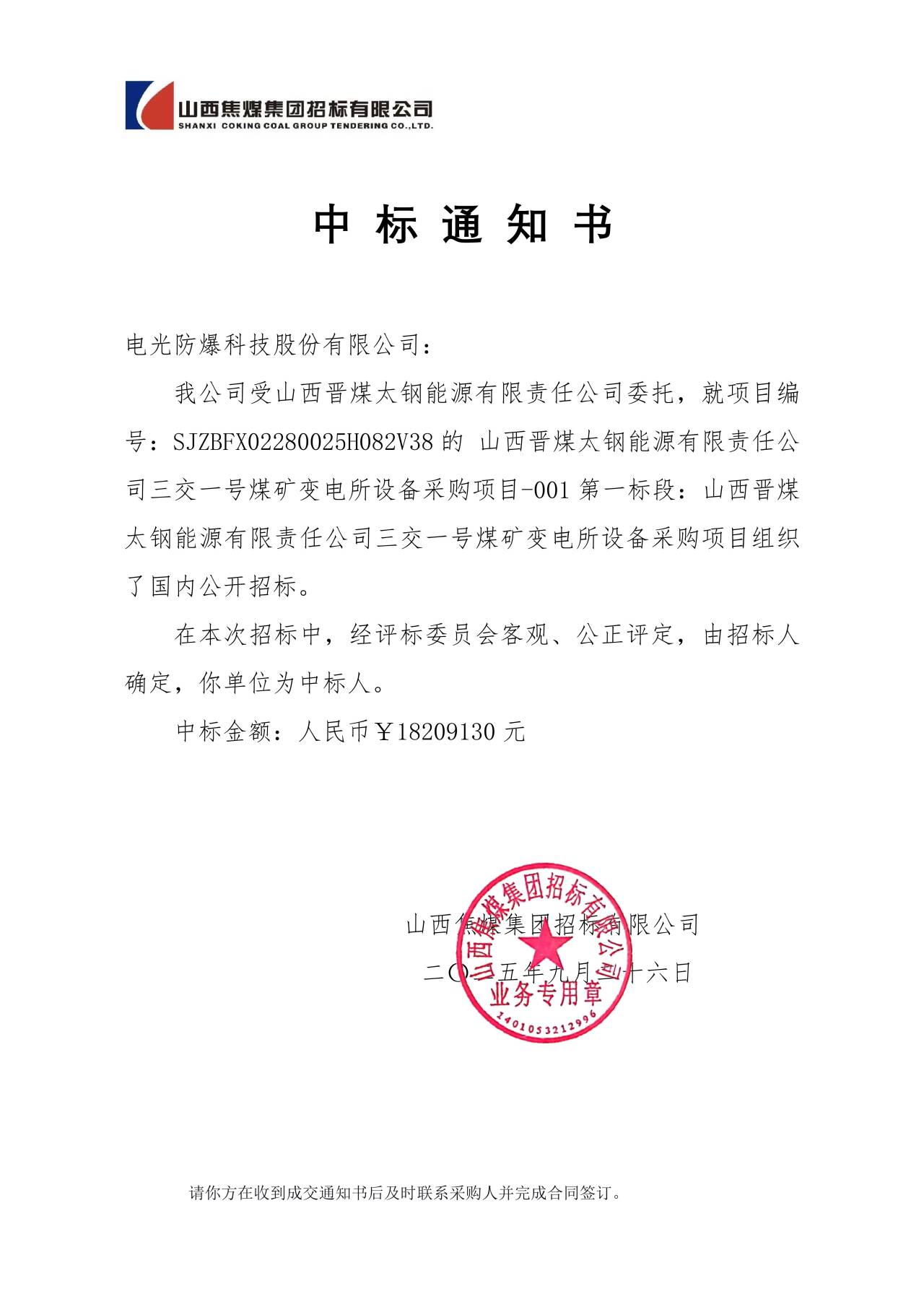 山西晋煤太钢能源有限责任公司三交一号煤矿变电所设备采购项目中标通知书