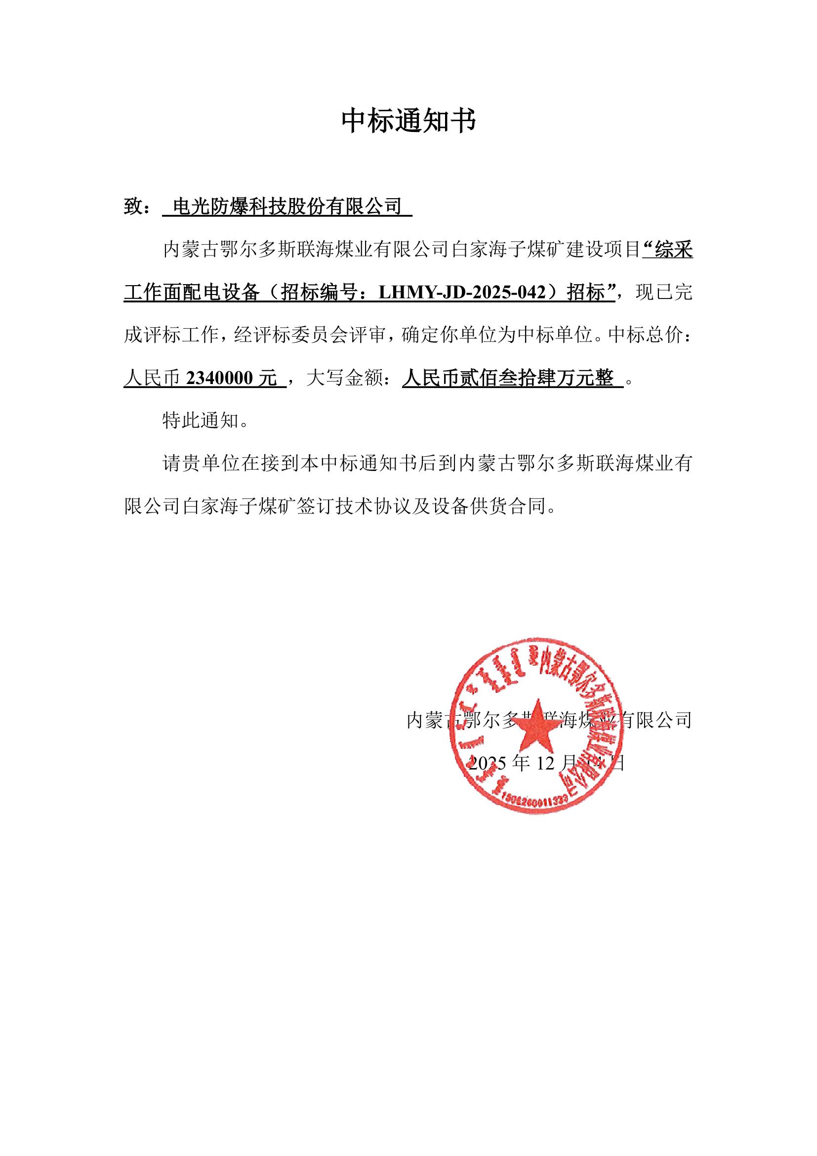 内蒙古鄂尔多斯联海煤业有限公司白家海子煤矿建设项目综采工作面配电设备招标中标通知书