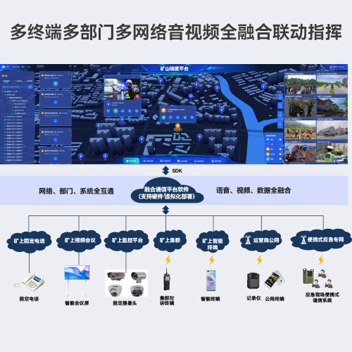 实现有线、无线、视频、广播、移动应急站 的融合调度,支持VoNR/Volte/Sip/WiFi 无 线手机和扩播电话的强插、强拆、组呼、群 呼、监听、录音,音视频 通话、短信未读、 语音未接提醒等 功能。