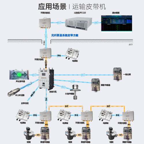 皮带机头灭火系统采用超细干粉灭火方式,KJ2662-Z矿用隔爆兼 本安型v光纤测温及灭火控制系统主机、KJJ12矿用本安型环网交换 机、KXH18矿用本安型声光信号器、KDW0.15/660B矿用隔爆兼本 质安全型不间断电源箱、测温光缆和监测用传感器、矿用本安型烟 雾传感器、矿用火焰传感器组成,皮带沿线自动灭火系统采用喷淋 灭火方式,由KJJ12矿用本安型环网交换机、矿用本安型烟雾传感 器、GPD10压力传感器、DFB20/10矿用隔爆型电电动球阀和灭火 管道等组成。
